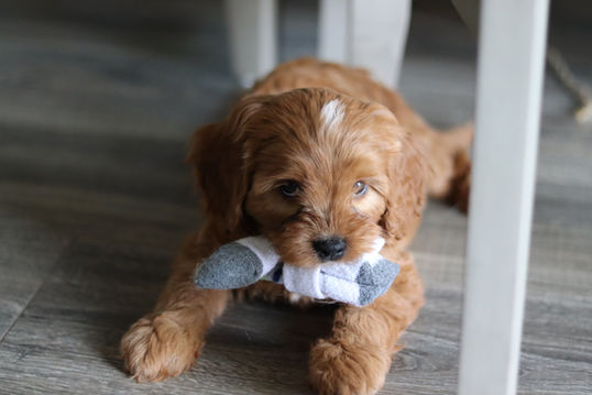 Puppies go home at 8 weeks old. They're sent home with our hand-made tote full of recommended goodies. A binder with their vet records, parents health certificates, microchip info, tips & tricks and pet insurance brochures will be provided.